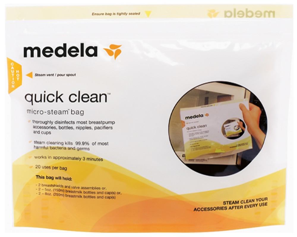 Segura, rápida y práctica. Con la bolsa para microondas Quick Clean de Medela puede desinfectar los accesorios de lactancia, como biberones, sacaleche y tubos en menos de tres minutos. Es más rápido y fácil que hirviéndolos.