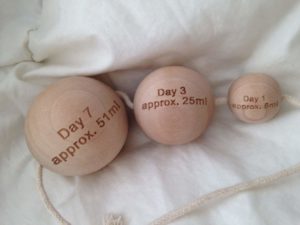 No tengo suficiente leche: nunca sabremos exactamente cuanta leche estamos produciendo. Si nos mantenemos cerca de nuestro bebé y lo alimentamos a libre demanda, vamos a producir la leche necesaria para él y la cantidad necesaria. El estomago de nuestro bebé es muy pequeño al principio entonces con el calostro bastará y poco a poco irá aumentando la cantidad a medida que crece: en la siguiente foto verás el tamaño del estomago de tu bebé desde el día 1 al día 7.
